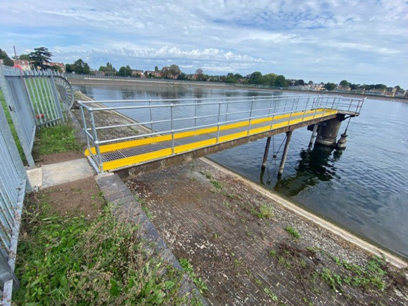 Barnfield Engineering designed GMS flooring and railing components. The choice of 25x5 OMF assured a strong and long-lasting flooring solution, while the galvanising procedure added extra defence against corrosion. The new railing was created using 42mm diameter tubing and was raised in height to improve safety. A yellow GRP kickplate was also installed as a visible safety measure.